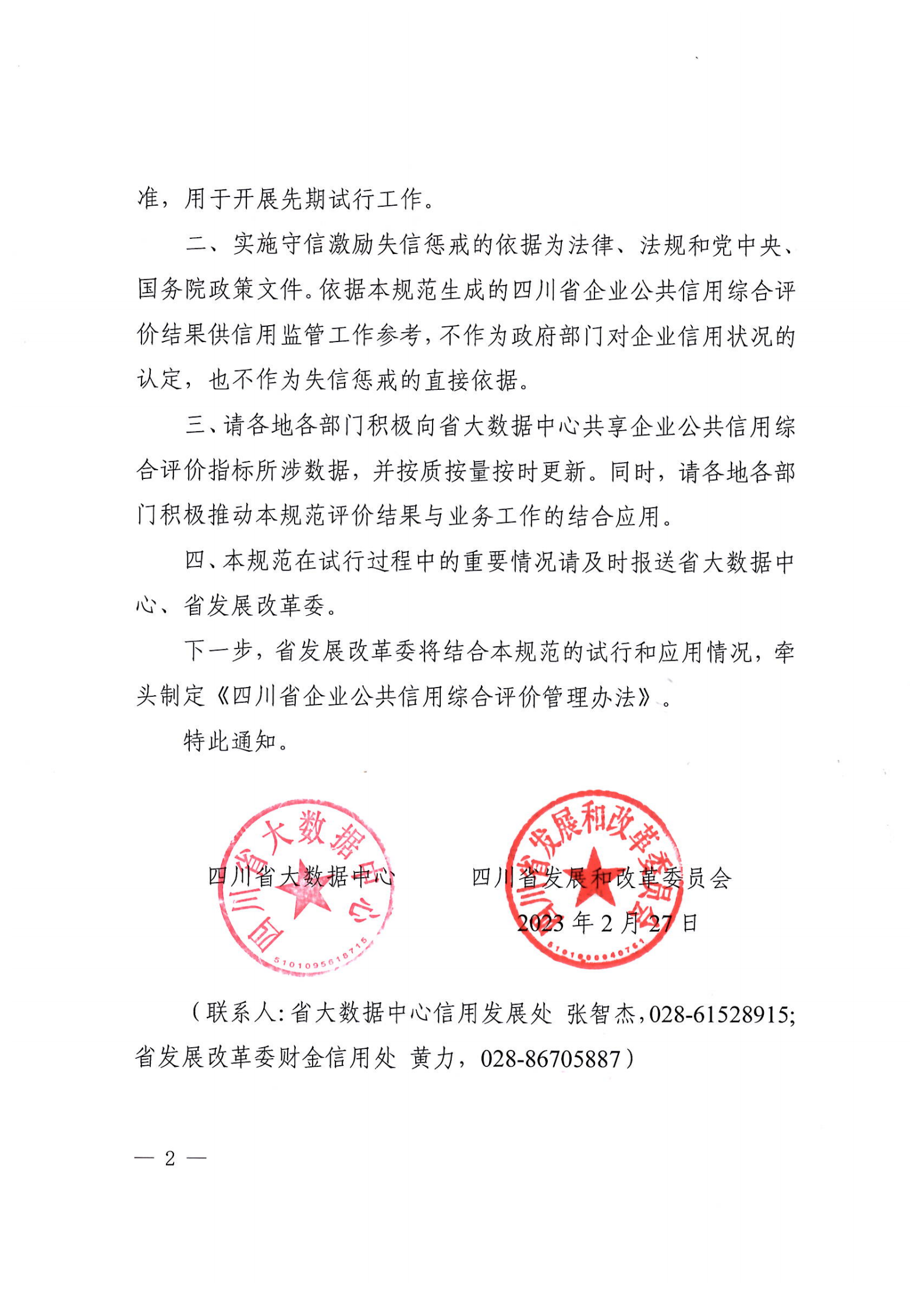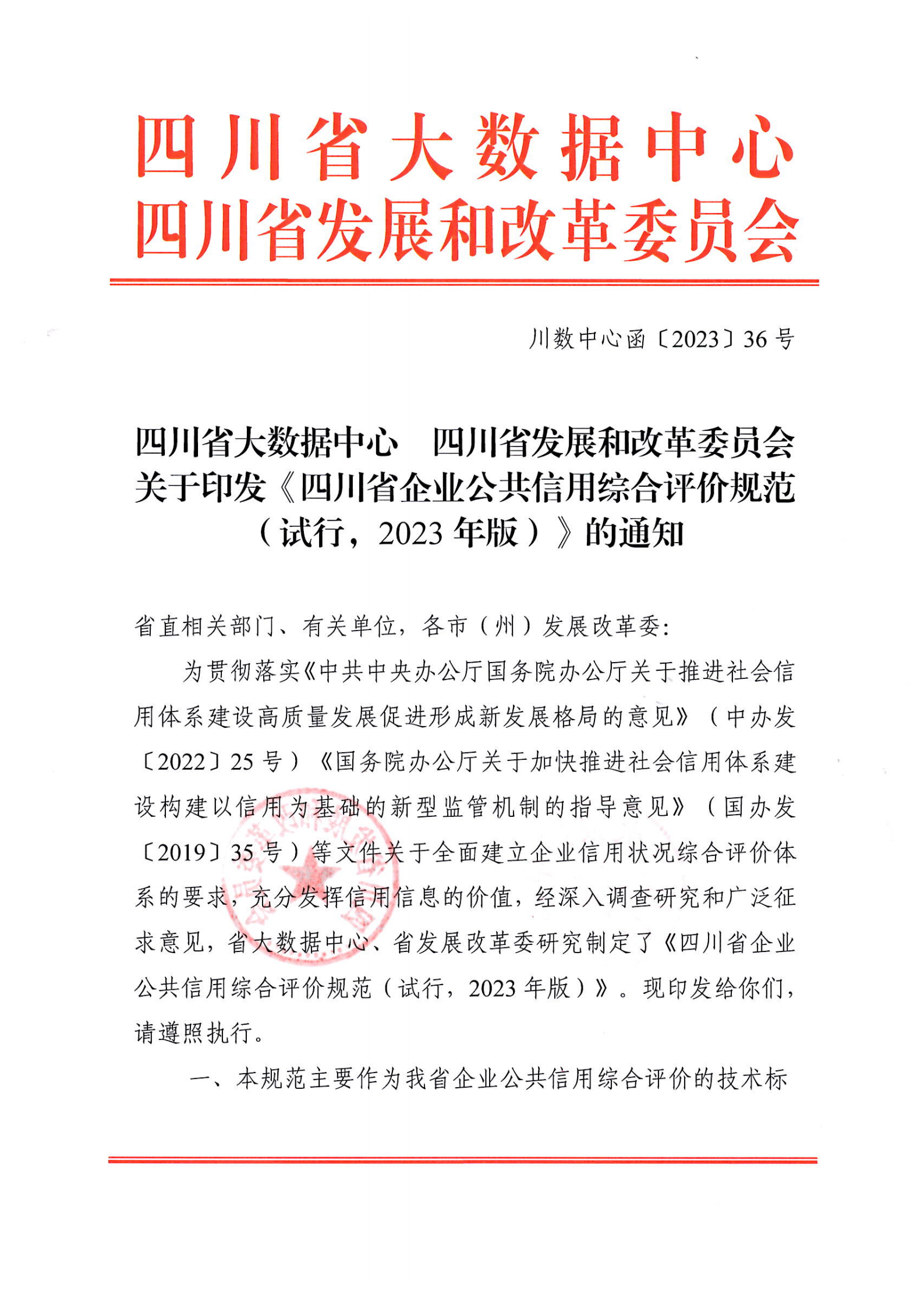 為貫徹落實(shí)《中共中央辦公廳國務(wù)院辦公廳關(guān)于推進(jìn)社會(huì)信用體系建設(shè)高質(zhì)量發(fā)展促進(jìn)形成新發(fā)展格局的意見》(中辦發(fā)〔2022〕25號)《國務(wù)院辦公廳關(guān)于加快推進(jìn)社會(huì)信用體系建設(shè)構(gòu)建以信用為基礎(chǔ)的新型監(jiān)管機(jī)制的指導(dǎo)意見》(國辦發(fā)〔2019〕35號)等文件關(guān)于全面建立企業(yè)信用狀況綜合評價(jià)體系的要求,充分發(fā)揮信用信息的價(jià)值,經(jīng)深入調(diào)查研究和廣泛征求意見,省大數(shù)據(jù)中心、省發(fā)展改革委研究制定了《四川省企業(yè)公共信用綜合評價(jià)規(guī)范(試行,2023年版)》。現(xiàn)印發(fā)給你們,請遵照執(zhí)行。